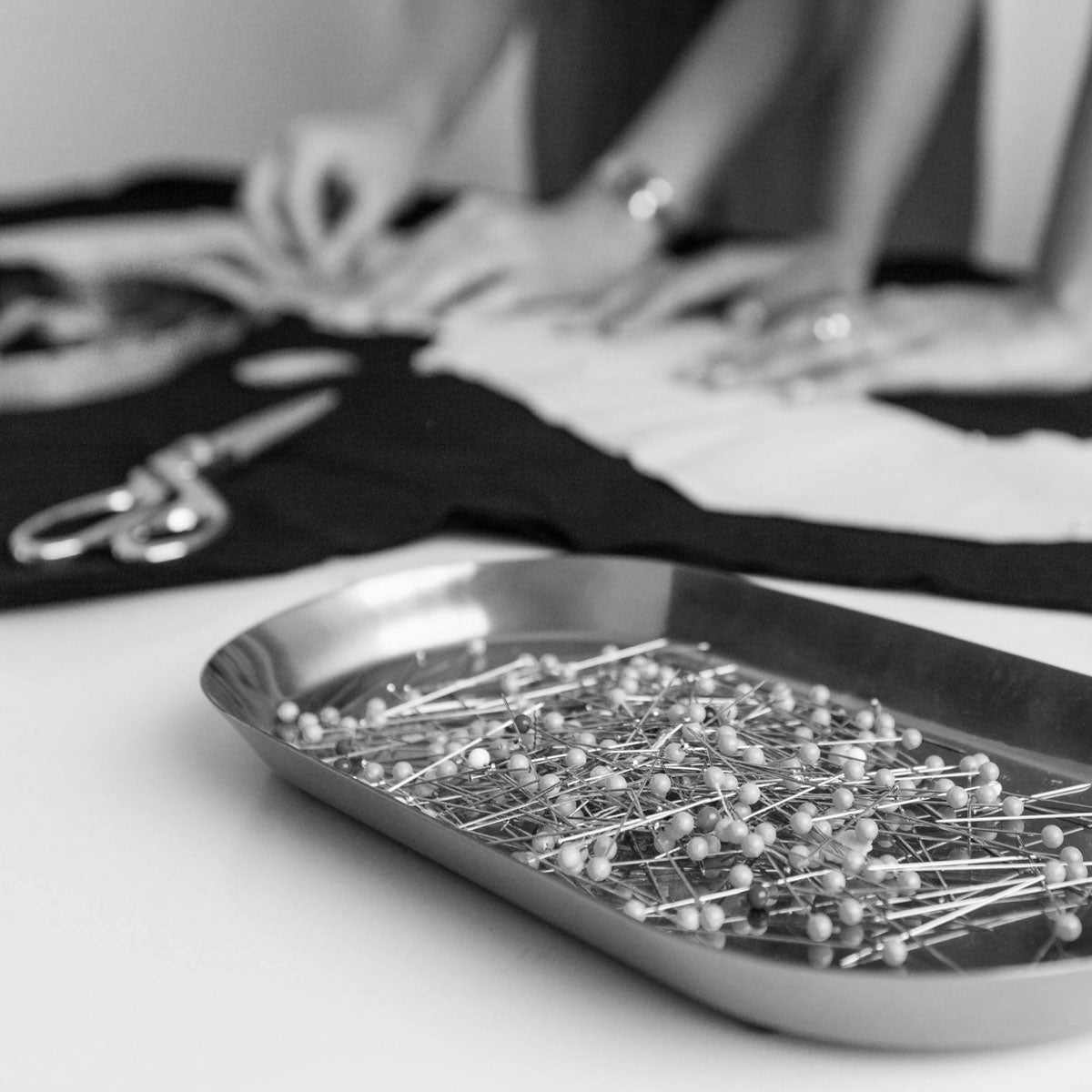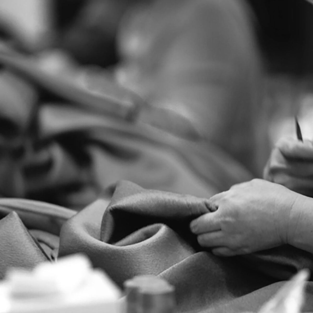 製作する一着一着のコートは、製造開始から完成、出荷に至るまで、128の工程を経なければなりません。デザイン図の繰り返し検討、360度人体工学に基づいた精緻な立体裁断、一針一針の手作業は、20年以上の経験を持つ熟練職人の手によって行われ、細部にわたって完璧を追求し、匠の技が息づいています。
